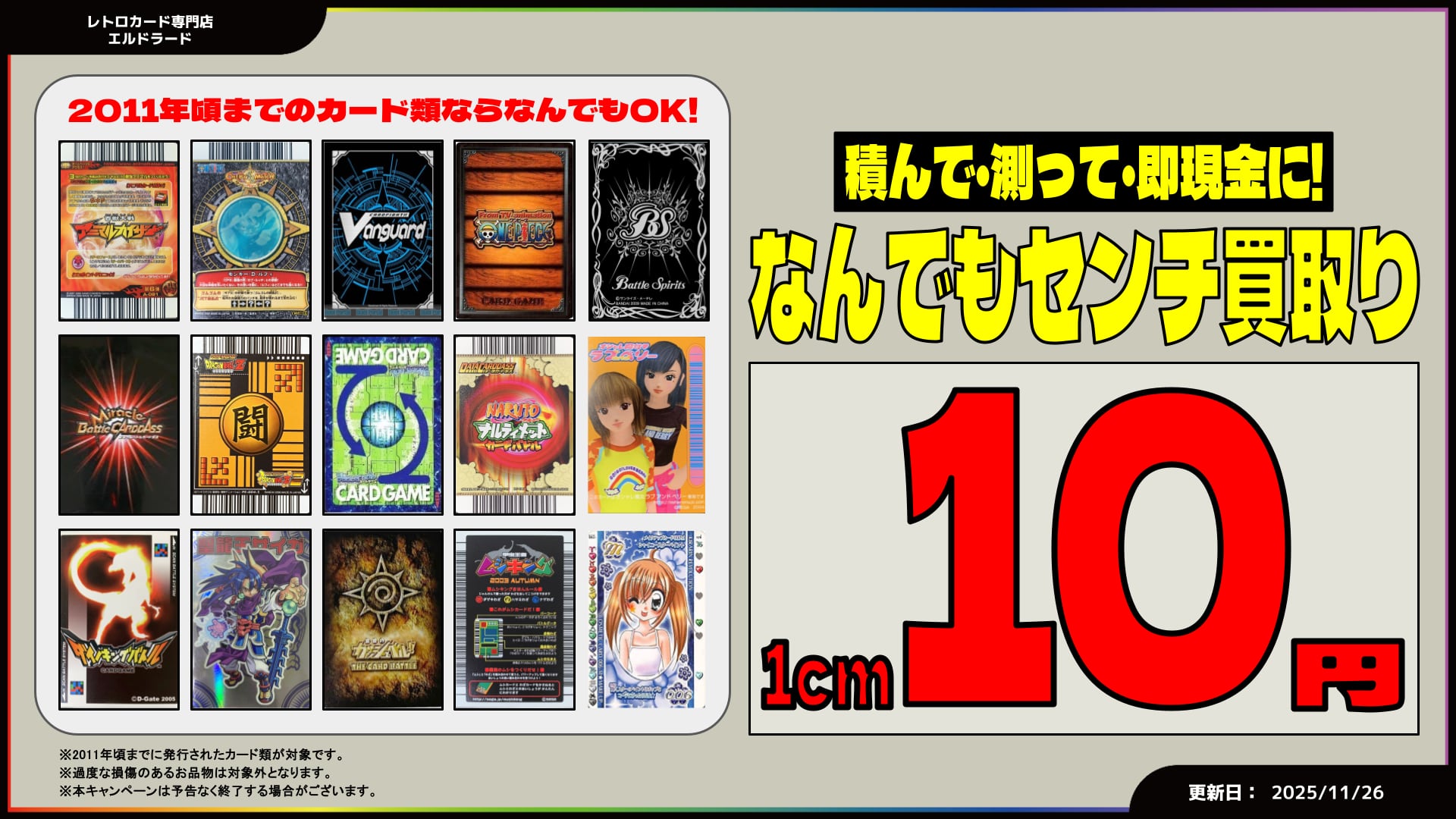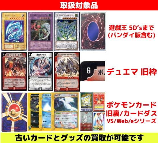遊戯王・ポケモン・デュエル・マスターズの古いカードが買取対象です。
